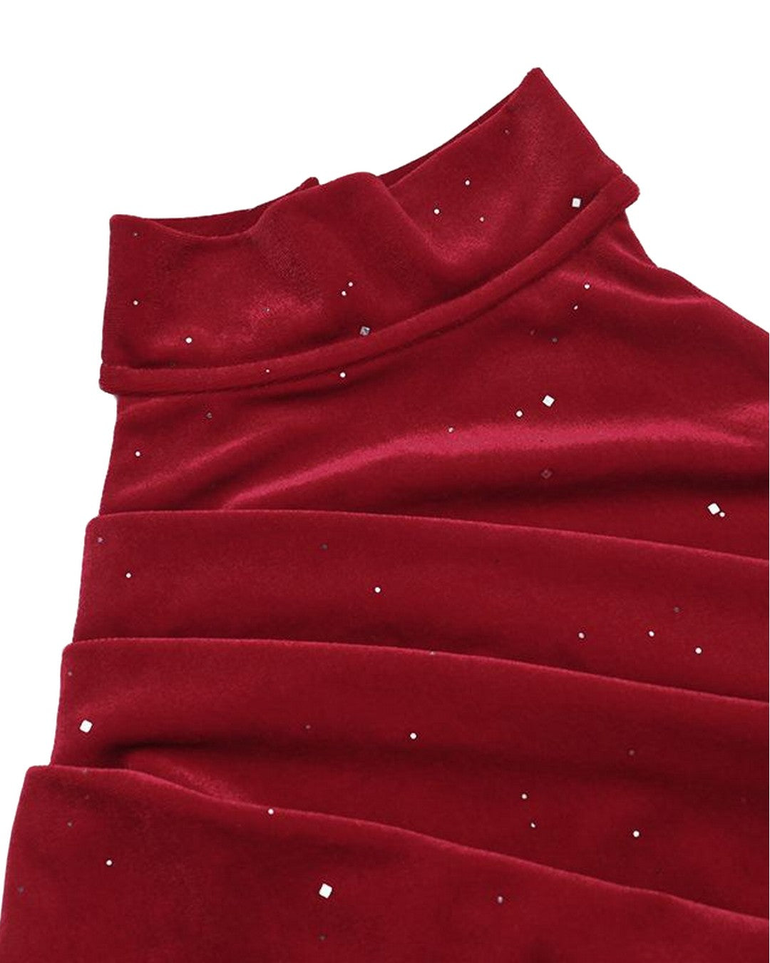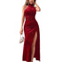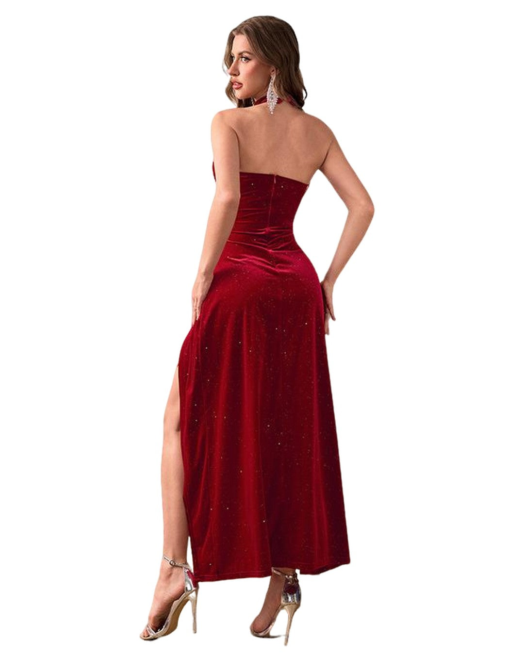 A masterpiece in sumptuous velvet with a refined shimmer, this halter maxi dress exudes elegance. Delicate ruching and a daring split enhance its feminine allure. An exclusive creation where timeless sophistication meets modern luxury