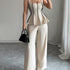 Elegant two-piece set with contrast piping details, featuring a tailored top and flowing wide-leg pants. A refined look for effortless style.