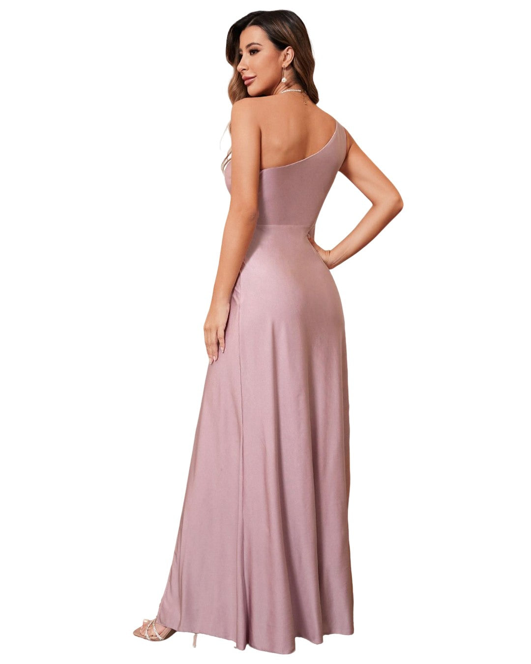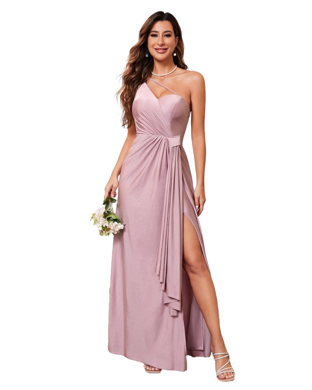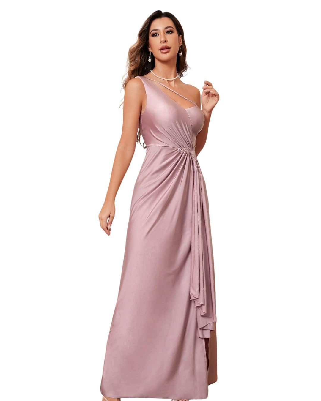 Sophisticated one-shoulder maxi dress with daring cutouts, ruched accents, and a high slit that blends elegance with modern allure.