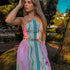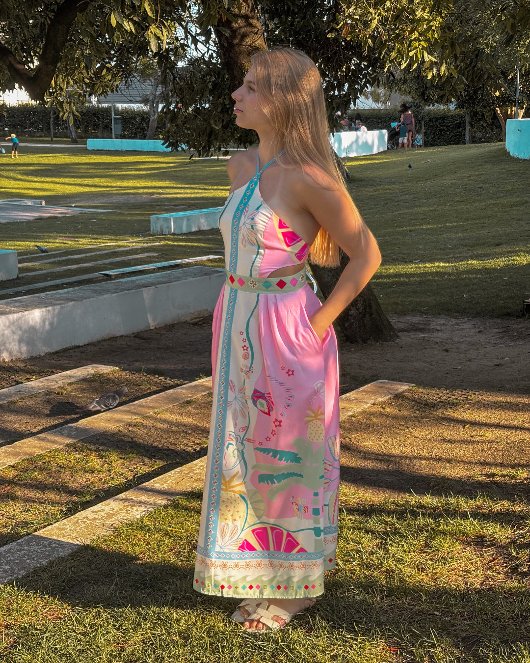 Stunning halter neck maxi dress with a flowing silhouette and vibrant print, perfect for vacations and special occasions.