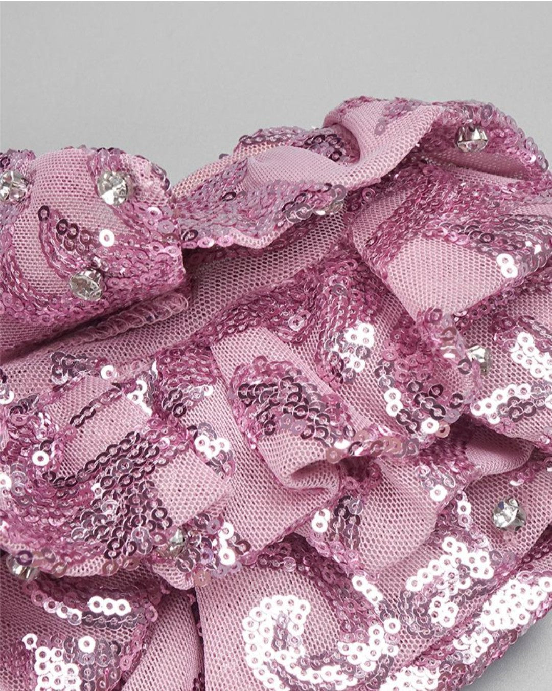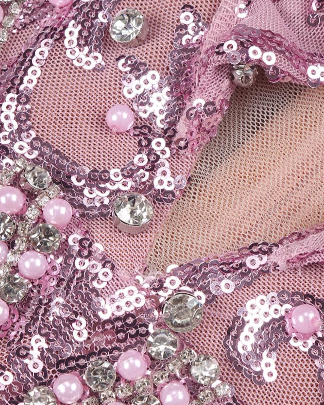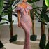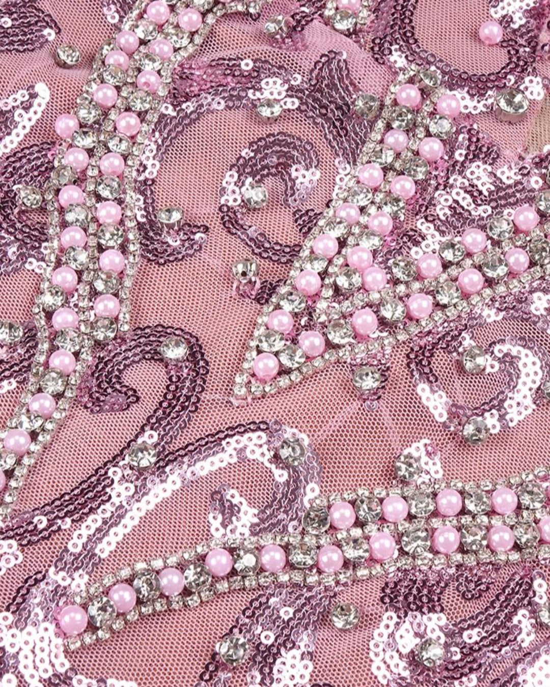 Elegant long pink tulle evening gown with sequin embroidery, perfect for galas and special events.