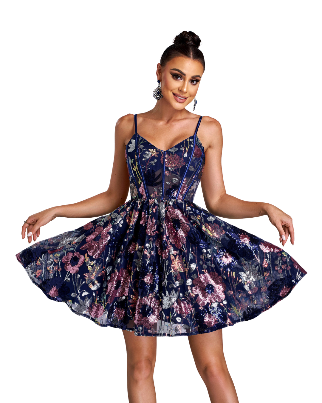 Elegant floral sequin cami dress with a slim silhouette, V-neckline, and backless design perfect for formal occasions and evening elegance.